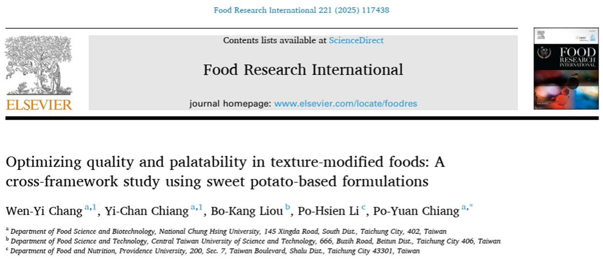 - 研究題目:Optimizing quality and palatability in texture-modified foods: A cross-framework study using sweet potato-based formulations