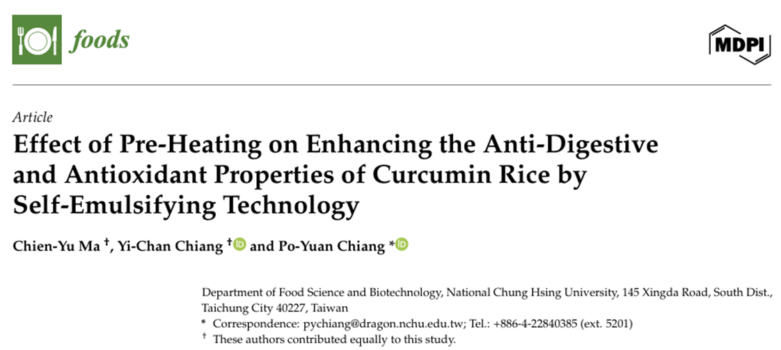 - 研究題目:Effect of Pre-Heating on Enhancing the Anti-Digestive and Antioxidant Properties of Curcumin Rice by Self-Emulsifying Technology