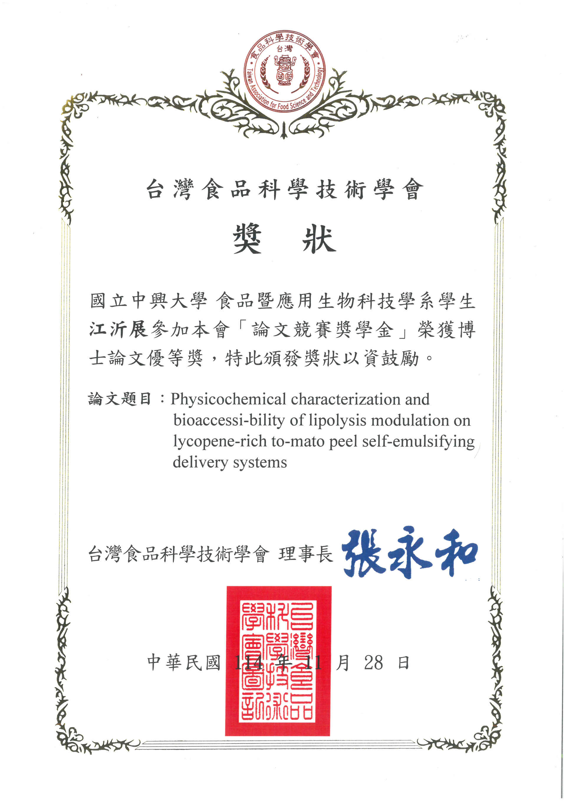 ┃狂賀!! 室友 江沂展 參加食科年會「論文競賽獎學金」榮獲博士論文優等獎~┃ 2025-12-02 成果發表 狂賀!! 室友 江沂展 參加2025第五十五屆食科年會「論文競賽獎學金」榮獲博士優等獎!! 回上一頁